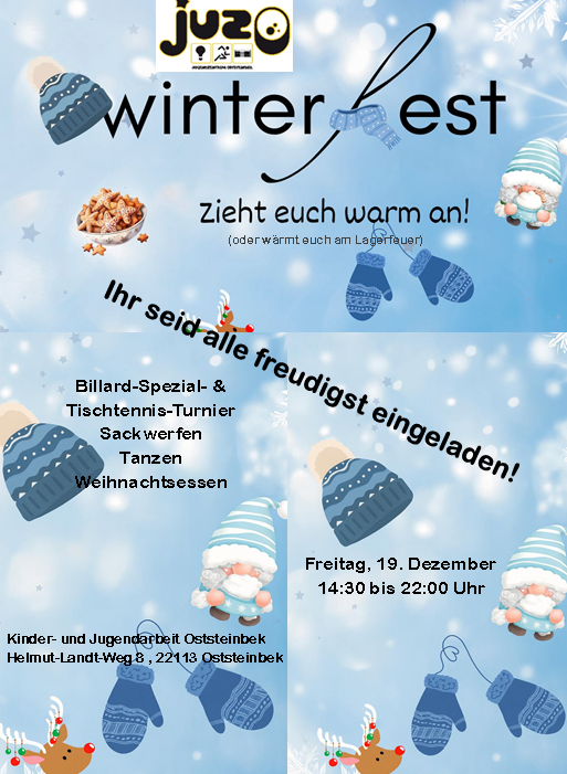 Willkommen auf der Webpage des JuzO! Das Jugendzentrum der Gemeinde Oststeinbek bietet im Rahmen der offenen Kinder- und Jugendarbeit ein vielfältiges Freizeitangebot für alle Kinder ab 8 Jahren, Jugendliche und Jungerwachsene an. Das Spektrum umfasst neben dem offenen Angebot auch diverse Gruppenangebote und Projekte im kreativen, sportlichen und musikalischen Bereich. Auch Ferienfreizeiten und Veranstaltungen wie Discos gehören dazu. Neben der Kinder- und Jugendarbeit werden im Jugendzentrum Oststeinbek auch Projekte der Gemeinwesenarbeit, wie z.B. ein Eltern-Kind-Café für Eltern mit Kleinkindern angeboten. Wir freuen uns immer über euren Besuch!